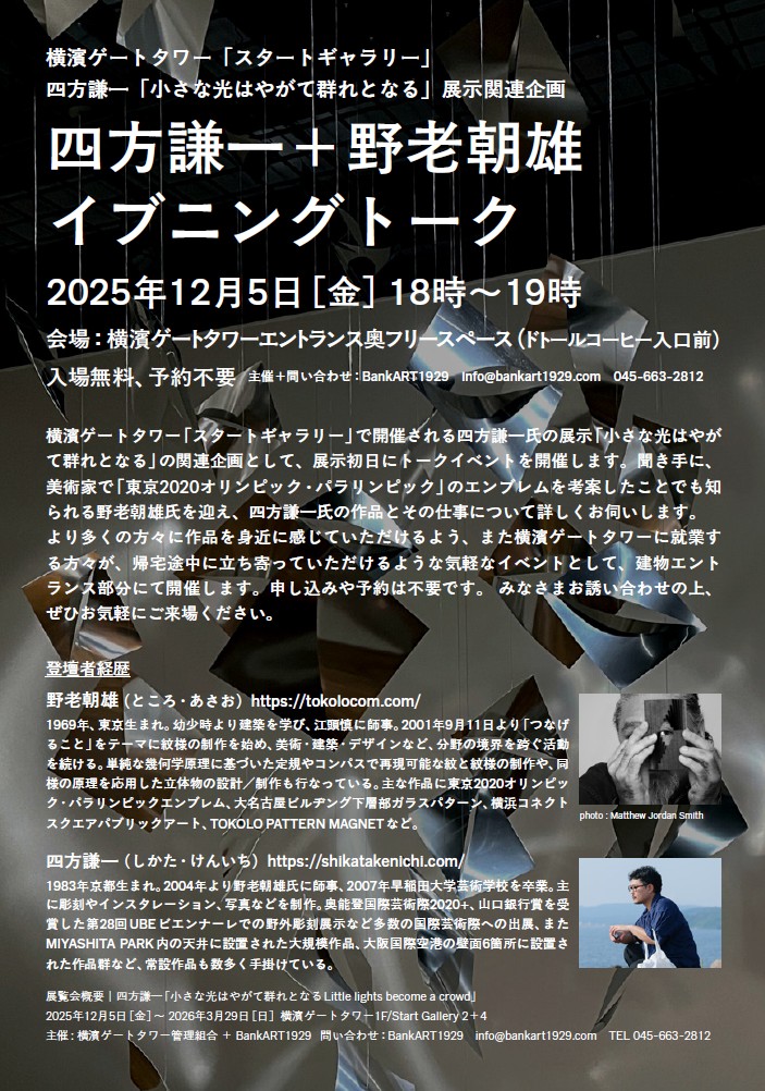 横濱ゲートタワー「スタートギャラリー」で開催される四方謙一氏の展示「小さな光はやがて群れとなる」の関連企画として、展示初日にトークイベントを開催します。